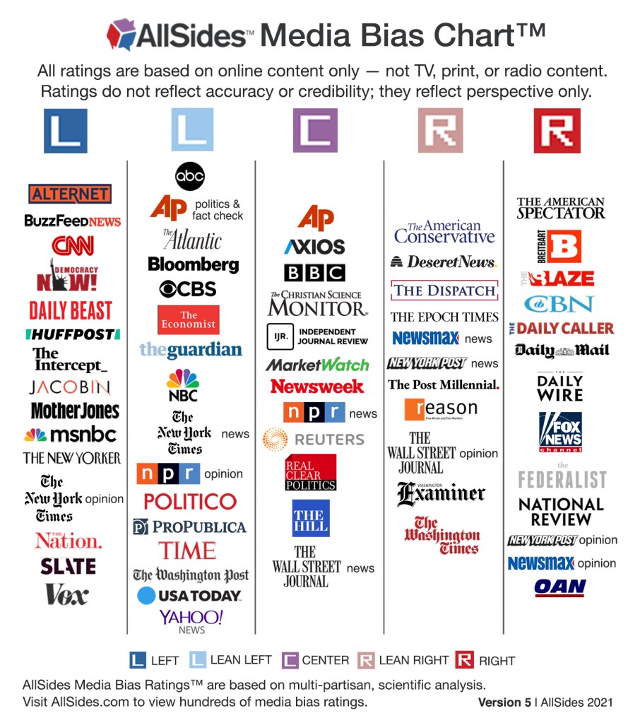 Audit your news consumption. Don’t read, watch or listen to the same news source all the time. A variety of voices — including voices we disagree with — helps us form a better-informed worldview. Allsides.com is a good place to find varying points of view on the same story. They also produce this media bias chart that can be helpful: